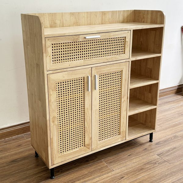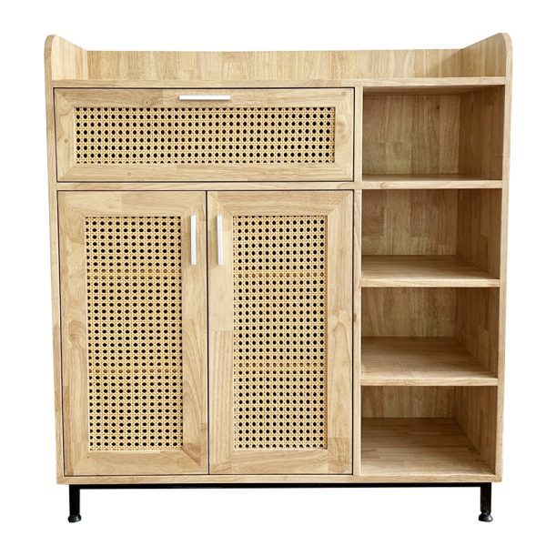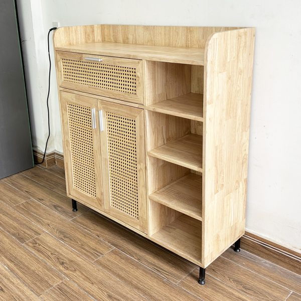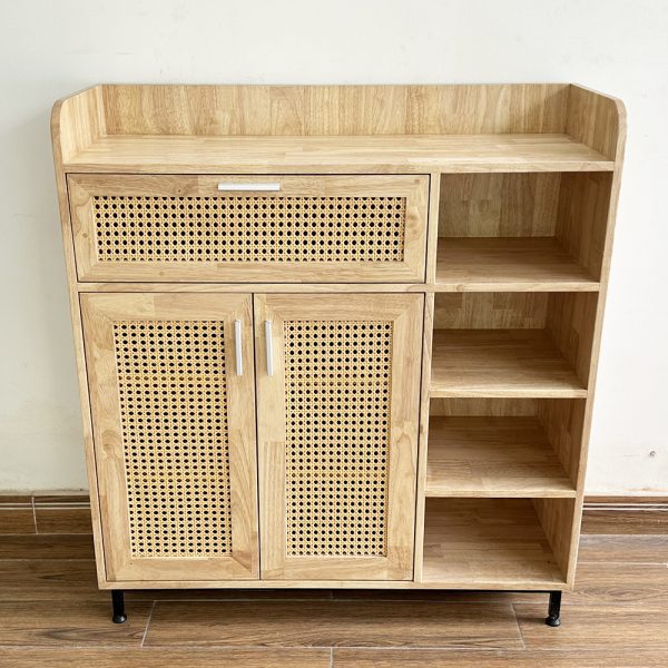 Tủ giày kết hợp kệ để đồ cửa lưới mây với chất liệu chính được sử dụng là gỗ cao su tiêu chuẩn AA được xử lý và hoàn thiện chống thấm đảm bảo bền bỉ theo thời gian, điểm nhấn cửa lưới mây mắt cáo mang đến sự mới lạ, độc đáo cho không gian của bạn. Tủ kệ giày cánh mây với thiết kế thông minh, phân chia các hệ để giày dép và kệ để đồ hợp lý, kích thước 1m vừa phải phù hợp với mọi không gian nhà ở hoặc căn hộ hiện nay.